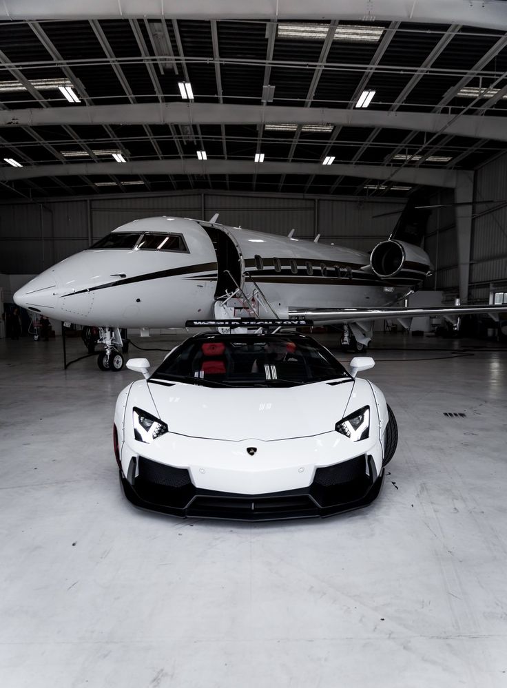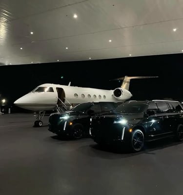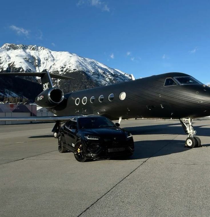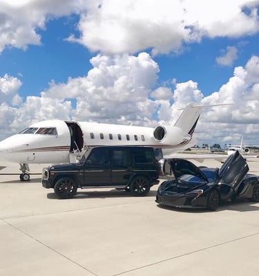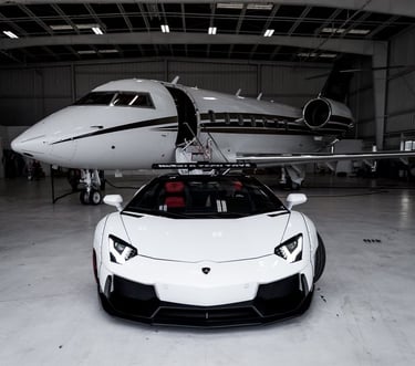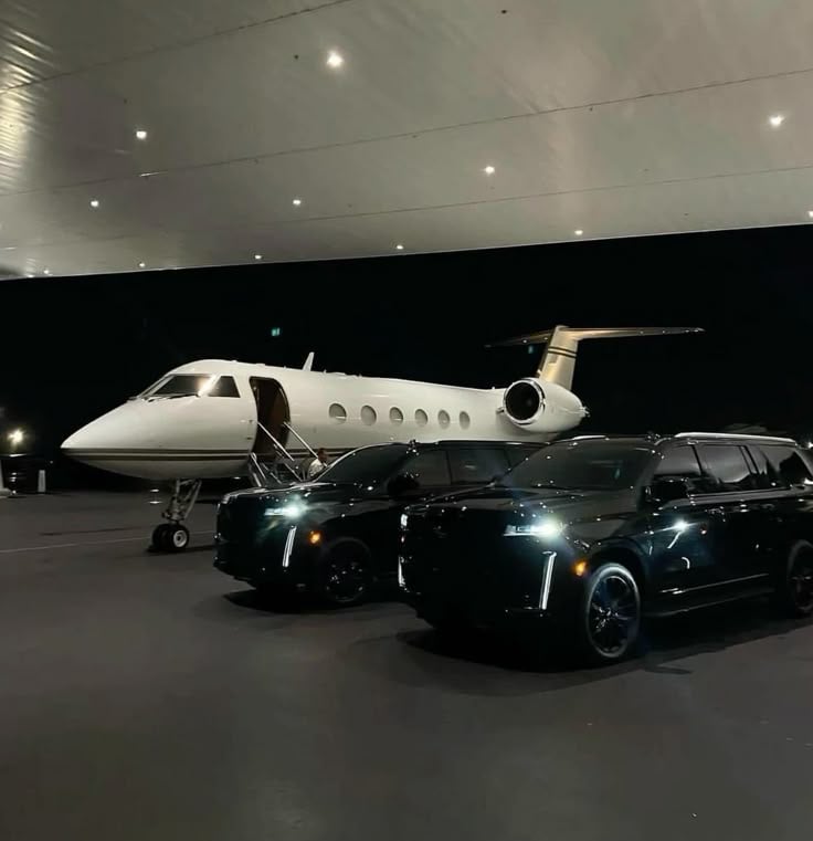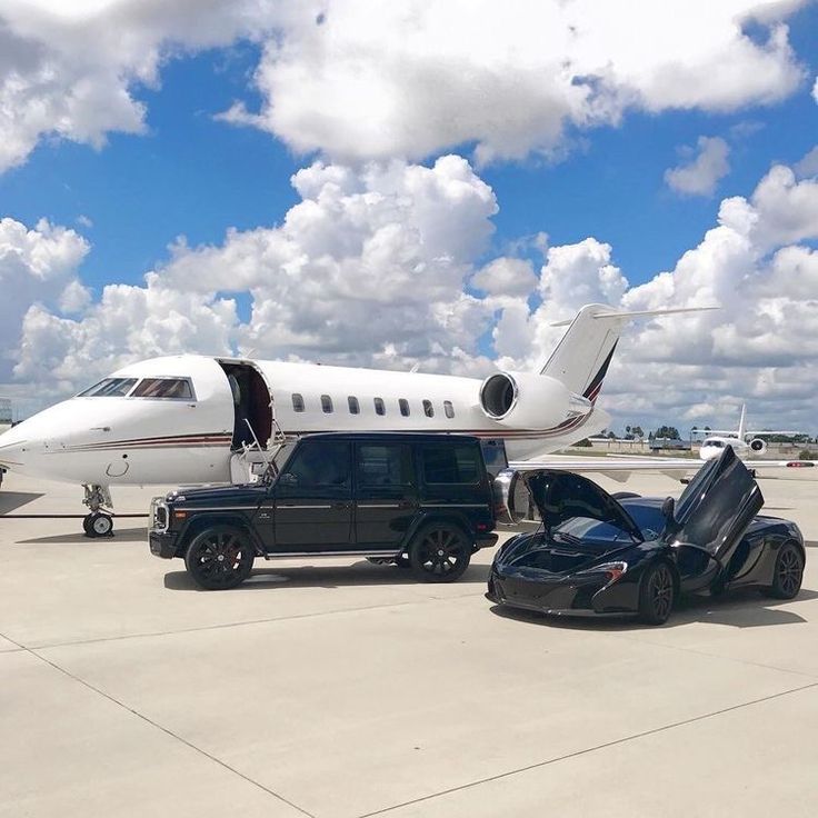 A sleek private jet is parked on an airport tarmac near two luxury black sports cars. The jet's staircase is extended, suggesting boarding or deboarding. The setting is clear and sunny, with a blue sky in the background and hangars nearby.